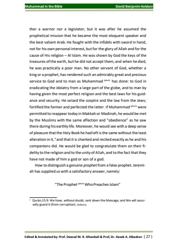 Muhammad in the Bible David Benjamin KeldaniEdited & Annotated by: Prof. Dawud M. R. Alhanbali & Prof, Dr. Kaseb A. Albadran ( 27 )ther a warrior nor a legislator; but it was after he assumed the prophetical mission that he became the most eloquent speaker and the best valiant Arab. He fought with the infidels with sword in hand, notfor his own personal interest, butfor the glory of Allah and for the cause of His religion – Al Islam. He was shown by God the keys of the treasures of the earth, but he did not accept them, and when he died, he was practically a poor man. No other servant of God, whether a king or a prophet, hasrendered such an admirably great and precious service to God and to man as Muhammad (pbuh) has done: to God in eradicating the idolatry from a large part of the globe, and to man by having given the most perfect religion and the best laws for his guidance and security. He seized the sceptre and the law from the Jews; fortified the former and perfected the latter. If Muhammad (pbuh) were permitted to reappear today in Makkah or Madinah, he would be met by the Muslims with the same affection and “obedience” as he saw there during his earthly life. Moreover, he would see with a deep sense of pleasure thatthe Holy Book he had left isthe same withoutthe least alteration in it, 6 and thatitis chanted and recited exactly as he and his companions did. He would be glad to congratulate them on their fidelity to the religion and to the unity of Allah, and to the factthat they have not made of him a god or son of a god.How to distinguish a genuine prophetfrom a false prophet. Jeremiah hassupplied us with a satisfactory answer, namely: “The Prophet(pbuh) Who PreachesIslam”6 Qurán,15:9. We have, without doubt, sent down the Message; and We will assuredly guard it (from corruption). (Editors).