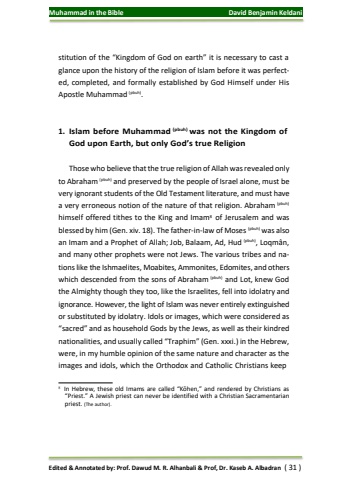 Muhammad in the Bible David Benjamin KeldaniEdited & Annotated by: Prof. Dawud M. R. Alhanbali & Prof, Dr. Kaseb A. Albadran ( 31 )stitution of the “Kingdom of God on earth” it is necessary to cast a glance upon the history of the religion of Islam before it was perfected, completed, and formally established by God Himself under His Apostle Muhammad (pbuh).1. Islam before Muhammad (pbuh) was not the Kingdom of God upon Earth, but only God’s true ReligionThose who believe thatthe true religion of Allah wasrevealed only to Abraham (pbuh) and preserved by the people of Israel alone, must be very ignorantstudents of the Old Testament literature, and must have a very erroneous notion of the nature of that religion. Abraham (pbuh)himself offered tithes to the King and Imam8 of Jerusalem and was blessed by him (Gen. xiv. 18). The father-in-law of Moses(pbuh)was also an Imam and a Prophet of Allah; Job, Balaam, Ad, Hud (pbuh), Loqmân, and many other prophets were not Jews. The various tribes and nationslike the Ishmaelites, Moabites, Ammonites, Edomites, and others which descended from the sons of Abraham (pbuh) and Lot, knew God the Almighty though they too, like the Israelites, fell into idolatry and ignorance. However, the light of Islam was never entirely extinguished or substituted by idolatry. Idols or images, which were considered as “sacred” and as household Gods by the Jews, as well as their kindred nationalities, and usually called “Traphim” (Gen. xxxi.) in the Hebrew, were, in my humble opinion of the same nature and character as the images and idols, which the Orthodox and Catholic Christians keep8In Hebrew, these old Imams are called “Kōhen,” and rendered by Christians as “Priest.” A Jewish priest can never be identified with a Christian Sacramentarian priest. (The author).