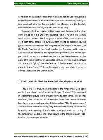 Muhammad in the Bible David Benjamin KeldaniEdited & Annotated by: Prof. Dawud M. R. Alhanbali & Prof, Dr. Kaseb A. Albadran ( 34 )er religion and acknowledged that Allah was not its God? Never! It is extremely unlikely that a Muhammadan Muslim community, so long as it is provided with the Book of Allah, the Mosque and the Mullah, could relapse into idolatry or even into Christianity.However, the true religion of God never took the form of the Kingdom of God as it did under the Quranic régime. Allah in His infinite wisdom had decreed that four great Powers of Darkness should succeed each other before His own Kingdom was to be established. The great ancient civilizations and empires of the Assyro-Chaldeans, of the Medo-Persians, of the Greeks and of the Romans, had to appear and flourish, to persecute and oppress the people of God, and to perpetrate all the evil and wickedness that the Devil could devise. All the glory of these great Powers consisted in their worshipping the Devil; and it was this “glory” that the “Prince of the Darkness” promised to grant to Jesus Christ (pbuh) from the top of a high mountain if he were only to follow him and worship him.2. Christ and his Disciples Preached the Kingdom of GodThey were, it is true, the harbingers of the Kingdom of God upon earth. The soul and the kernel of the Gospel of Jesus(pbuh) is contained in that famous clause in his prayer: “Thy Kingdom come.” For twenty centuries, the Christians of all denominations and shades of belief have been praying and repeating this invocation. “Thy Kingdom come,” and God alone knows how long they will continue to pray for and vainly anticipate its coming. This Christian anticipation of the coming of the Kingdom of God is of the same nature as the anticipation of Judaism for the coming of Messiah.