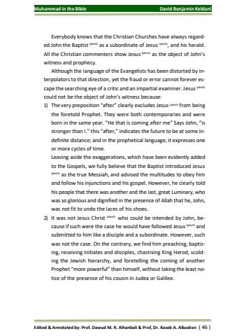 Muhammad in the Bible David Benjamin KeldaniEdited & Annotated by: Prof. Dawud M. R. Alhanbali & Prof, Dr. Kaseb A. Albadran ( 46 )Everybody knows that the Christian Churches have always regarded John the Baptist (pbuh) as a subordinate of Jesus(pbuh), and his herald. All the Christian commenters show Jesus(pbuh) as the object of John’s witness and prophecy.Although the language of the Evangelists has been distorted by interpolators to that direction, yet the fraud or error cannot forever escape the searching eye of a critic and an impartial examiner. Jesus(pbuh)could not be the object of John’s witness because:1) The very preposition “after” clearly excludes Jesus(pbuh) from being the foretold Prophet. They were both contemporaries and were born in the same year. “He that is coming after me” Says John, “is stronger than I.” this “after,” indicates the future to be atsome indefinite distance; and in the prophetical language, it expresses one or more cycles of time.Leaving aside the exaggerations, which have been evidently added to the Gospels, we fully believe that the Baptist introduced Jesus (pbuh) as the true Messiah, and advised the multitudes to obey him and follow his injunctions and his gospel. However, he clearly told his people that there was another and the last, great Luminary, who was so glorious and dignified in the presence of Allah that he, John, was not fit to undo the laces of his shoes.2) It was not Jesus Christ (pbuh) who could be intended by John, because ifsuch were the case he would have followed Jesus(pbuh) and submitted to him like a disciple and a subordinate. However,such was not the case. On the contrary, we find him preaching, baptizing, receiving initiates and disciples, chastising King Herod, scolding the Jewish hierarchy, and foretelling the coming of another Prophet “more powerful” than himself, without taking the least notice of the presence of his cousin in Judea or Galilee.