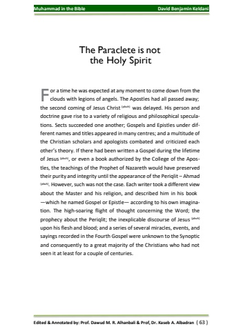 Muhammad in the Bible David Benjamin KeldaniEdited & Annotated by: Prof. Dawud M. R. Alhanbali & Prof, Dr. Kaseb A. Albadran ( 63 )FThe Paraclete is not the Holy Spiritor a time he was expected at any moment to come down from the clouds with legions of angels. The Apostles had all passed away;the second coming of Jesus Christ (pbuh) was delayed. His person and doctrine gave rise to a variety of religious and philosophical speculations. Sects succeeded one another; Gospels and Epistles under different names and titles appeared in many centres; and a multitude of the Christian scholars and apologists combated and criticized each other’s theory. If there had been written a Gospel during the lifetime of Jesus (pbuh), or even a book authorized by the College of the Apostles, the teachings of the Prophet of Nazareth would have preserved their purity and integrity until the appearance of the Periqlit – Ahmad (pbuh). However,such was not the case. Each writer took a different view about the Master and his religion, and described him in his book—which he named Gospel or Epistle— according to his own imagination. The high-soaring flight of thought concerning the Word; the prophecy about the Periqlit; the inexplicable discourse of Jesus (pbuh)upon his flesh and blood; and a series ofseveral miracles, events, and sayings recorded in the Fourth Gospel were unknown to the Synoptic and consequently to a great majority of the Christians who had not seen it at least for a couple of centuries.