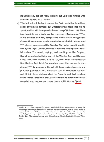 Muhammad in the Bible David Benjamin KeldaniEdited & Annotated by: Prof. Dawud M. R. Alhanbali & Prof, Dr. Kaseb A. Albadran ( 71 )ing Jews: They did not really kill him; but God took him up unto Himself” (Quran, 4:157-158)17.d) “The last but not the least mark of the Periqlyte is that he will not speak anything of himself, but whatsoever he hears that will he speak, and he will show you the future things” (John xv. 13). There is not one iota, not a single word or comment of Muhammad (pbuh)or of his devoted and holy companions in the text of the glorious Quran. All its contents are the revealed Word of Allah. Muhammad (pbuh) uttered, pronounced the Word of God as he heard it read to him by the Angel Gabriel, and was reduced to writing by the faithful scribes. The words, sayings, and teachings of the Prophet, though sacred and edifying, are notthe Word of God, and they are called Ahādith or Traditions. Is he not, then, even in this description, the true Periqlyte? Can you show us another person, besides Ahmad (pbuh), to possess in himself all these material, moral, and practical qualities, marks, and distinctions of Periqlyte? You cannot. I think I have said enough of the Periqlyte and shall conclude with a sacred verse from the Quran: “I follow no other than whatis revealed unto me; nor am I more than a Public Warner” (x1vi.).17 Qurán, 4:157. That they said (in boast), “We killed Christ, Jesus the son of Mary, theMessenger of Allah; but they killed him not, nor crucified him, but so it was made toappear to them, and those who differ therein are full of doubts, with no (certain)knowledge, but only conjecture to follow, for of a surety they killed him not, Qurán4:158. Nay, Allah raised him up unto Himself; and Allah is Exalted in Power, Wise.(Editors).