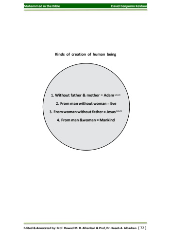 Muhammad in the Bible David Benjamin KeldaniEdited & Annotated by: Prof. Dawud M. R. Alhanbali & Prof, Dr. Kaseb A. Albadran ( 72 )Kinds of creation of human beingWithout father & mother = Adam(pbuh)From man without woman = EveFrom woman without father = Jesus(pbuh)From man &woman = Mankind
