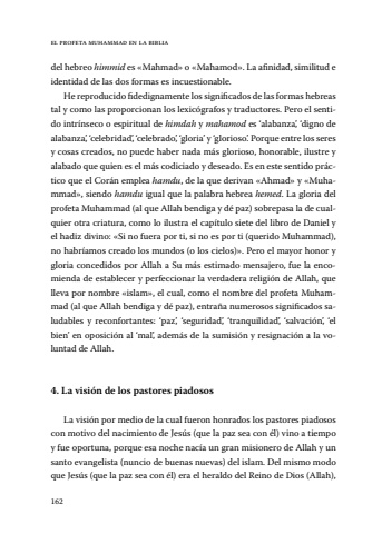 162el profeta muhammad en la bibliadel hebreo himmid es «Mahmad» o «Mahamod». La afinidad, similitud e identidad de las dos formas es incuestionable. He reproducido fidedignamente los significados de las formas hebreas tal y como las proporcionan los lexicógrafos y traductores. Pero el sentido intrínseco o espiritual de himdah y mahamod es ‘alabanza’, ‘digno de alabanza’, ‘celebridad’, ‘celebrado’, ‘gloria’ y ‘glorioso’. Porque entre los seres y cosas creados, no puede haber nada más glorioso, honorable, ilustre y alabado que quien es el más codiciado y deseado. Es en este sentido práctico que el Corán emplea hamdu, de la que derivan «Ahmad» y «Muhammad», siendo hamdu igual que la palabra hebrea hemed. La gloria del profeta Muhammad (al que Allah bendiga y dé paz) sobrepasa la de cualquier otra criatura, como lo ilustra el capítulo siete del libro de Daniel y el hadiz divino: «Si no fuera por ti, si no es por ti (querido Muhammad), no habríamos creado los mundos (o los cielos)». Pero el mayor honor y gloria concedidos por Allah a Su más estimado mensajero, fue la encomienda de establecer y perfeccionar la verdadera religión de Allah, que lleva por nombre «islam», el cual, como el nombre del profeta Muhammad (al que Allah bendiga y dé paz), entraña numerosos significados saludables y reconfortantes: ‘paz’, ‘seguridad’, ‘tranquilidad’, ‘salvación’, ‘el bien’ en oposición al ‘mal’, además de la sumisión y resignación a la voluntad de Allah. 4. La visión de los pastores piadosos La visión por medio de la cual fueron honrados los pastores piadosos con motivo del nacimiento de Jesús (que la paz sea con él) vino a tiempo y fue oportuna, porque esa noche nacía un gran misionero de Allah y un santo evangelista (nuncio de buenas nuevas) del islam. Del mismo modo que Jesús (que la paz sea con él) era el heraldo del Reino de Dios (Allah),