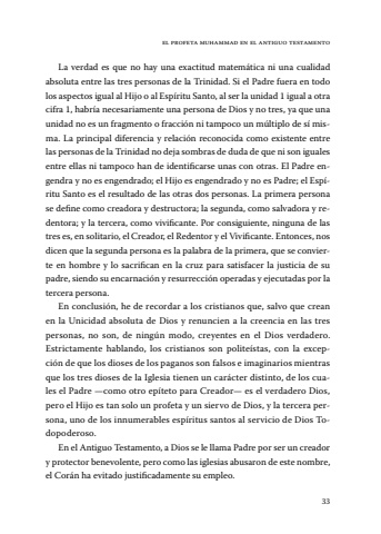 33el profeta muhammad en el antiguo testamentoLa verdad es que no hay una exactitud matemática ni una cualidad absoluta entre las tres personas de la Trinidad. Si el Padre fuera en todo los aspectos igual al Hijo o al Espíritu Santo, al ser la unidad 1 igual a otra cifra 1, habría necesariamente una persona de Dios y no tres, ya que una unidad no es un fragmento o fracción ni tampoco un múltiplo de sí misma. La principal diferencia y relación reconocida como existente entre las personas de la Trinidad no deja sombras de duda de que ni son iguales entre ellas ni tampoco han de identificarse unas con otras. El Padre engendra y no es engendrado; el Hijo es engendrado y no es Padre; el Espíritu Santo es el resultado de las otras dos personas. La primera persona se define como creadora y destructora; la segunda, como salvadora y redentora; y la tercera, como vivificante. Por consiguiente, ninguna de las tres es, en solitario, el Creador, el Redentor y el Vivificante. Entonces, nos dicen que la segunda persona es la palabra de la primera, que se convierte en hombre y lo sacrifican en la cruz para satisfacer la justicia de su padre, siendo su encarnación y resurrección operadas y ejecutadas por la tercera persona. En conclusión, he de recordar a los cristianos que, salvo que crean en la Unicidad absoluta de Dios y renuncien a la creencia en las tres personas, no son, de ningún modo, creyentes en el Dios verdadero. Estrictamente hablando, los cristianos son politeístas, con la excepción de que los dioses de los paganos son falsos e imaginarios mientras que los tres dioses de la Iglesia tienen un carácter distinto, de los cuales el Padre —como otro epíteto para Creador— es el verdadero Dios, pero el Hijo es tan solo un profeta y un siervo de Dios, y la tercera persona, uno de los innumerables espíritus santos al servicio de Dios Todopoderoso. En el Antiguo Testamento, a Dios se le llama Padre por ser un creador y protector benevolente, pero como las iglesias abusaron de este nombre, el Corán ha evitado justificadamente su empleo.