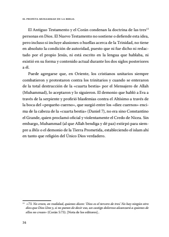 34el profeta muhammad en la bibliaEl Antiguo Testamento y el Corán condenan la doctrina de las tres13personas en Dios. El Nuevo Testamento no sostiene o defiende esta idea, pero incluso si incluye alusiones o huellas acerca de la Trinidad, no tiene en absoluto la condición de autoridad, puesto que ni fue dicho ni redactado por el propio Jesús, ni está escrito en la lengua que hablaba, ni existió en su forma y contenido actual durante los dos siglos posteriores a él.Puede agregarse que, en Oriente, los cristianos unitarios siempre combatieron y protestaron contra los trinitarios y cuando se enteraron de la total destrucción de la «cuarta bestia» por el Mensajero de Allah (Muhammad), lo aceptaron y lo siguieron. El demonio que habló a Eva a través de la serpiente y profirió blasfemias contra el Altísimo a través de la boca del «pequeño cuerno», que surgió entre los «diez cuernos» encima de la cabeza de la «cuarta bestia» (Daniel 7), no era sino Constantino el Grande, quien proclamó oficial y violentamente el Credo de Nicea. Sin embargo, Muhammad (al que Allah bendiga y dé paz) extirpó para siempre a Iblis o el demonio de la Tierra Prometida, estableciendo el islam ahí en tanto que religión del Único Dios verdadero.13 «73. No creen, en realidad, quienes dicen: ‘Dios es el tercero de tres’. No hay ningún otro dios que Dios Uno y, si no paran de decir eso, un castigo doloroso alcanzará a quienes de ellos no crean» (Corán 5:73). [Nota de los editores]..