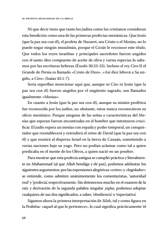 68el profeta muhammad en la bibliaNi que decir tiene que tanto los judíos como los cristianos consideran esta bendición como una de las primeras profecías mesiánicas. Que Jesús (que la paz sea con él), el profeta de Nazaret, sea Cristo o el Mesías, no lo puede negar ningún musulmán, porque el Corán le reconoce este título. Que todos los reyes israelitas y principales sacerdotes fueron ungidos con el santo óleo compuesto de aceite de oliva y varias especias lo sabemos por las escrituras hebreas (Éxodo 30:23-33). Incluso el rey Ciro II el Grande de Persia es llamado «Cristo de Dios». «Así dice Jehová a Su ungido, a Ciro» (Isaías 45:1-7). Sería superfluo mencionar aquí que, aunque ni Ciro ni Jesús (que la paz sea con él) fueron ungidos por el ungüento sagrado, son llamados igualmente «Mesías». En cuanto a Jesús (que la paz sea con él), aunque su misión profética fue reconocida por los judíos, no obstante, estos nunca reconocieron su oficio mesiánico. Porque ninguna de las señas o características del Mesías que esperan fueron encontradas en el hombre que intentaron crucificar. El judío espera un mesías con espada y poder temporal, un conquistador que reestablecerá y extenderá el reino de David (que la paz sea con él) y que reunirá al disperso Israel en la tierra de Canaán, sometiendo a varias naciones bajo su yugo. Pero no podían aclamar como tal a quien predicaba en el monte de los Olivos, a quien nació en un pesebre. Para mostrar que esta profecía antigua se cumplió práctica y literalmente en Muhammad (al que Allah bendiga y dé paz), podemos adelantar los siguientes argumentos: por las expresiones alegóricas «cetro» y «legislador» se entiende, como admiten unánimemente los comentaristas, ‘autoridad real’ y ‘profecía’, respectivamente. Sin detenernos mucho en el examen de la raíz y derivación de la segunda palabra singular yiqha, podemos adoptar cualquiera de sus dos significados, a saber, ‘obediencia’ o ‘expectativa’. Sigamos ahora la primera interpretación de Siloh, tal y como figura en la Peshitta: «aquel al que le pertenece», lo cual significa prácticamente ‘el